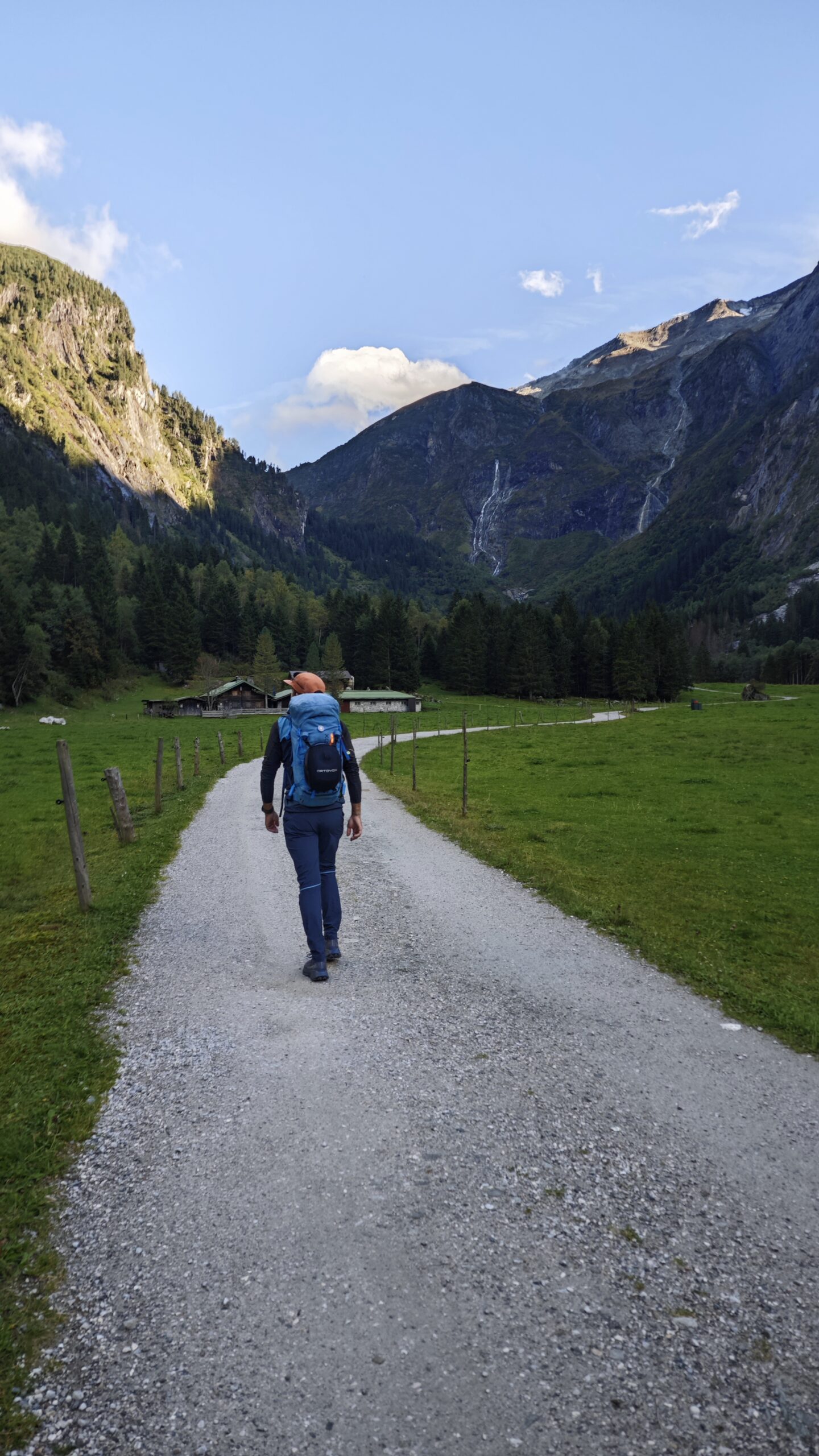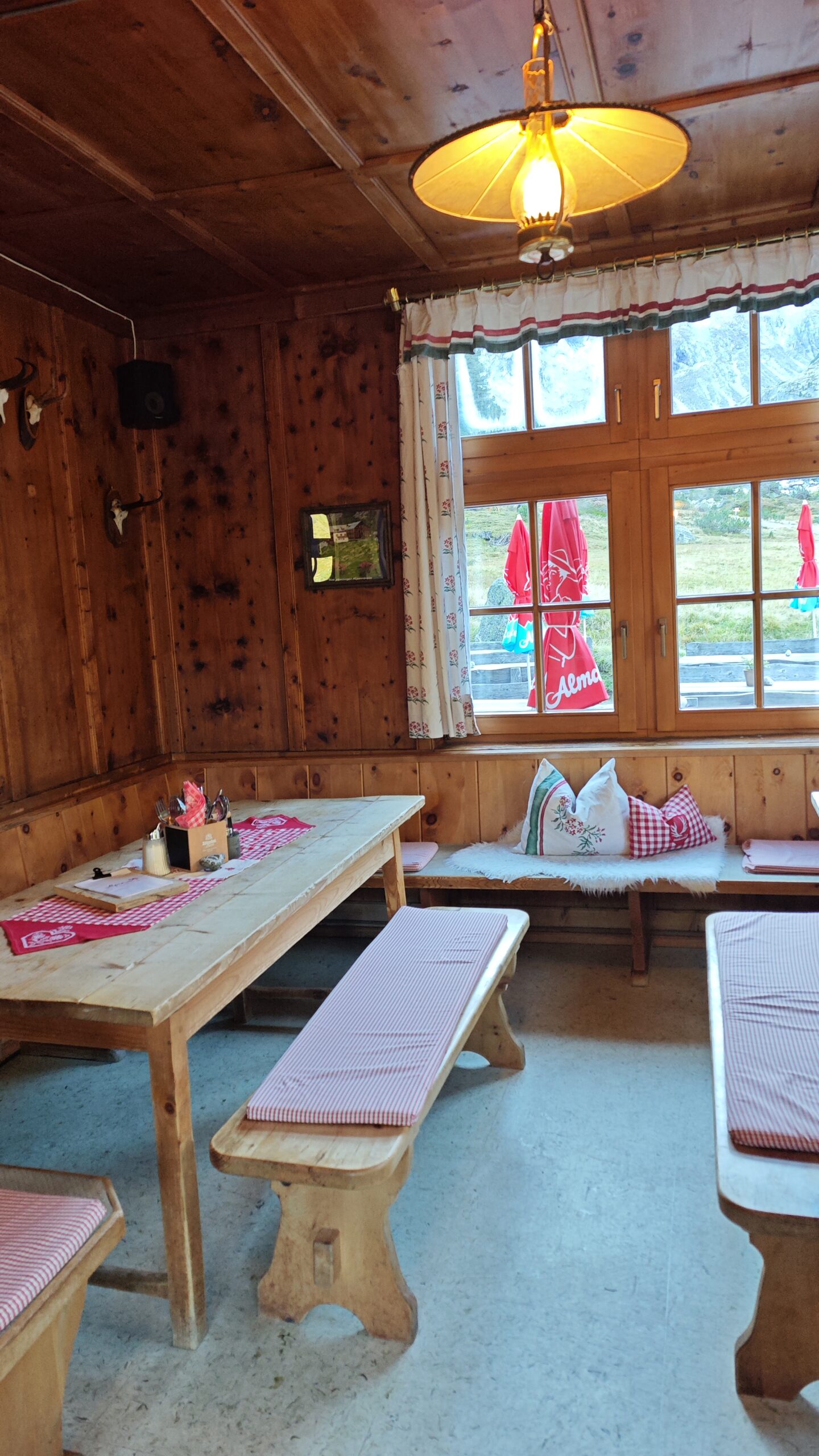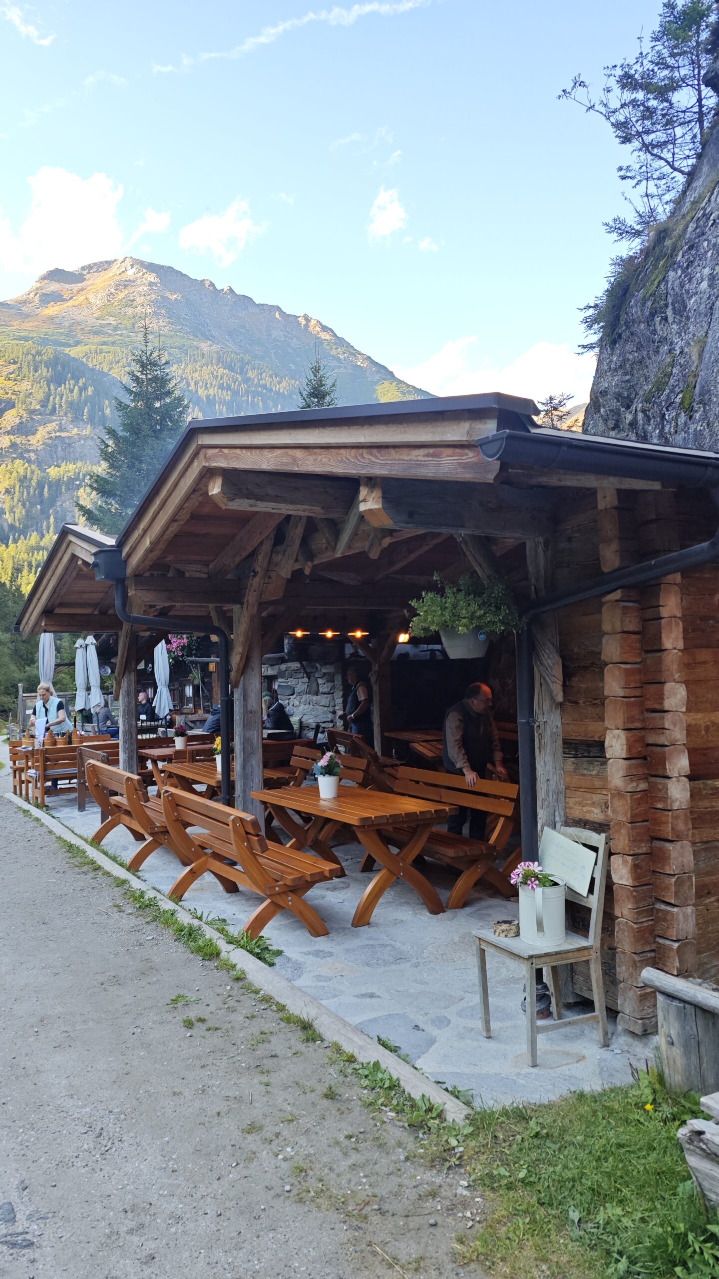 A medida que ganamos altura, el valle se vuelve más abierto y solitario, ofreciendo una sensación de aislamiento total, perfecta para desconectar. Llegamos finalmente al Alpenrosehütte, un refugio acogedor con una terraza panorámica ideal para disfrutar del atardecer sobre las montañas.
