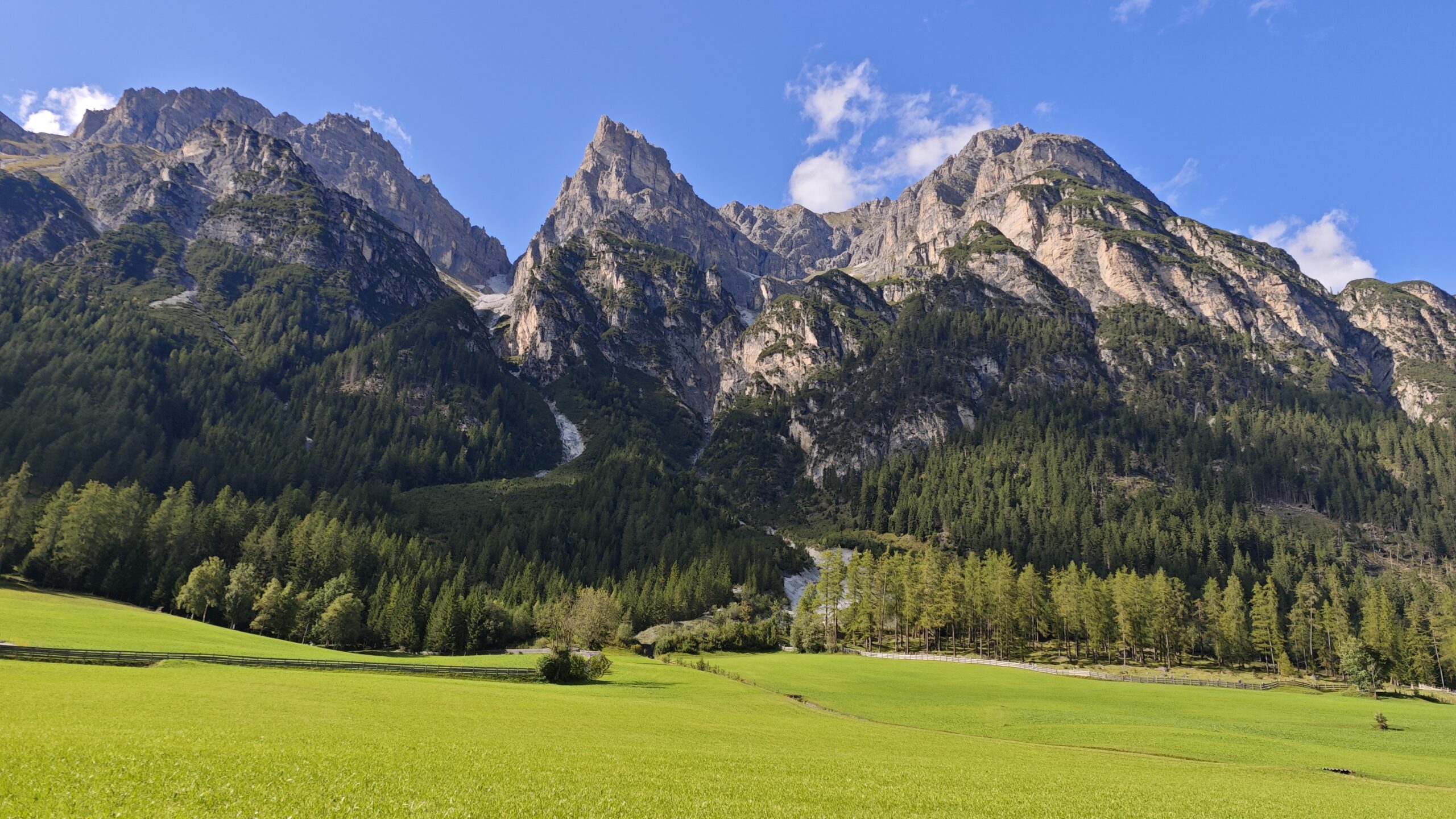 Tras despertar frente a las murallas del Habicht, iniciamos una larga bajada hacia el valle de Stubai, cerrando así la primera parte de nuestra travesía. El sendero serpentea entre praderas alpinas y pequeños arroyos, ofreciendo panorámicas excepcionales del valle de Neustift y las montañas que lo rodean.