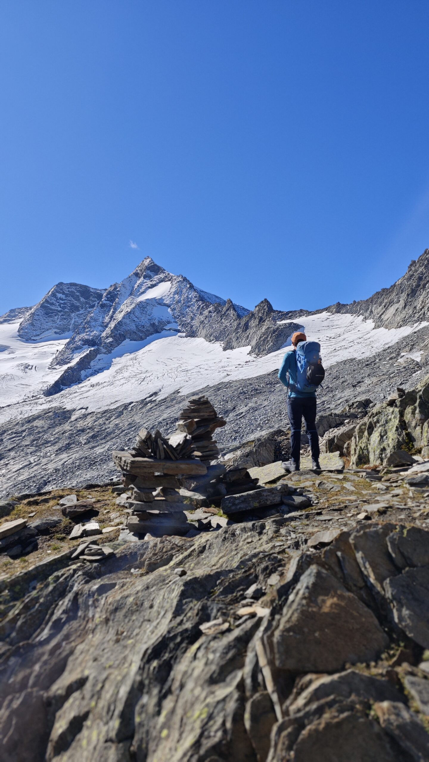 Desde el refugio iniciamos la etapa más exigente y espectacular del viaje, una jornada alpina que nos llevará a rozar los glaciares del Zillertal. Comenzamos ascendiendo por la morrena glaciar, rodeados por un paisaje imponente dominado por los picos Großes Möseler (3.479 m), Turnerkamp (3.416 m) y Hornspitze (3.254 m), que marcan la frontera natural con Italia.
