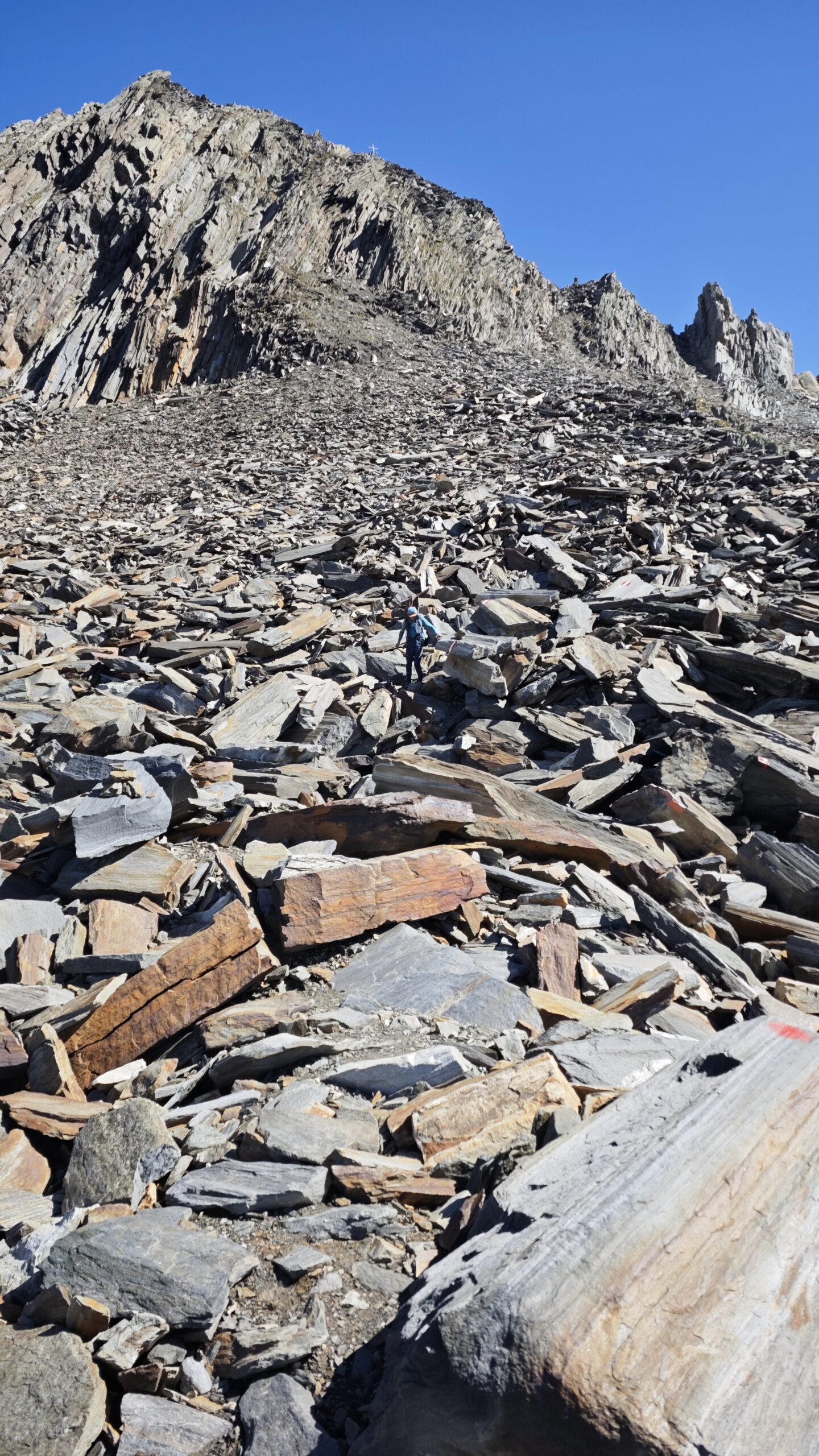 La subida a nuestro pico se desarrolla por un sendero rocoso y sostenido, con un cómodo zigzag que nos acerca poco a poco a las faldas de la montaña. La parte final exige concentración: una trepada de grado II/III, equipada con cables en los tramos más verticales, que nos permite progresar con seguridad en un terreno aéreo y de una belleza sobrecogedora.