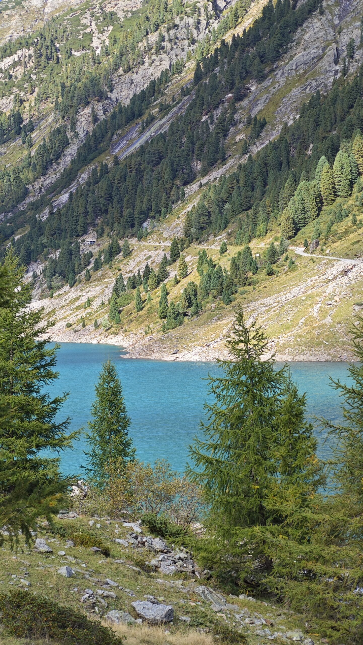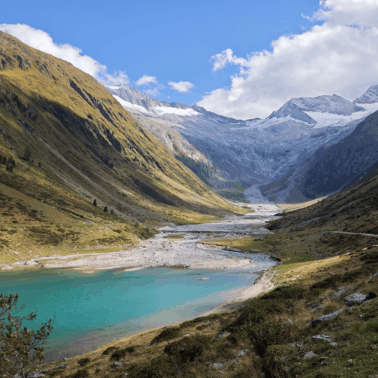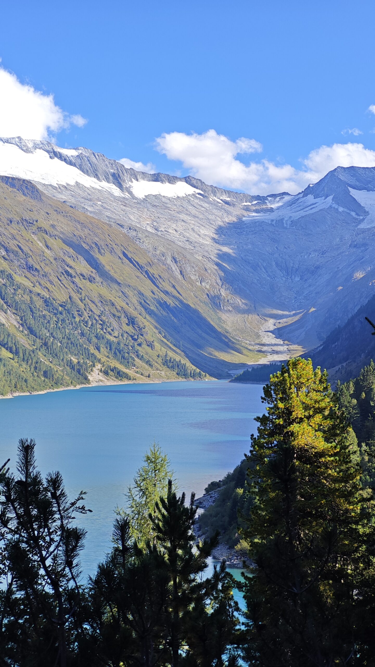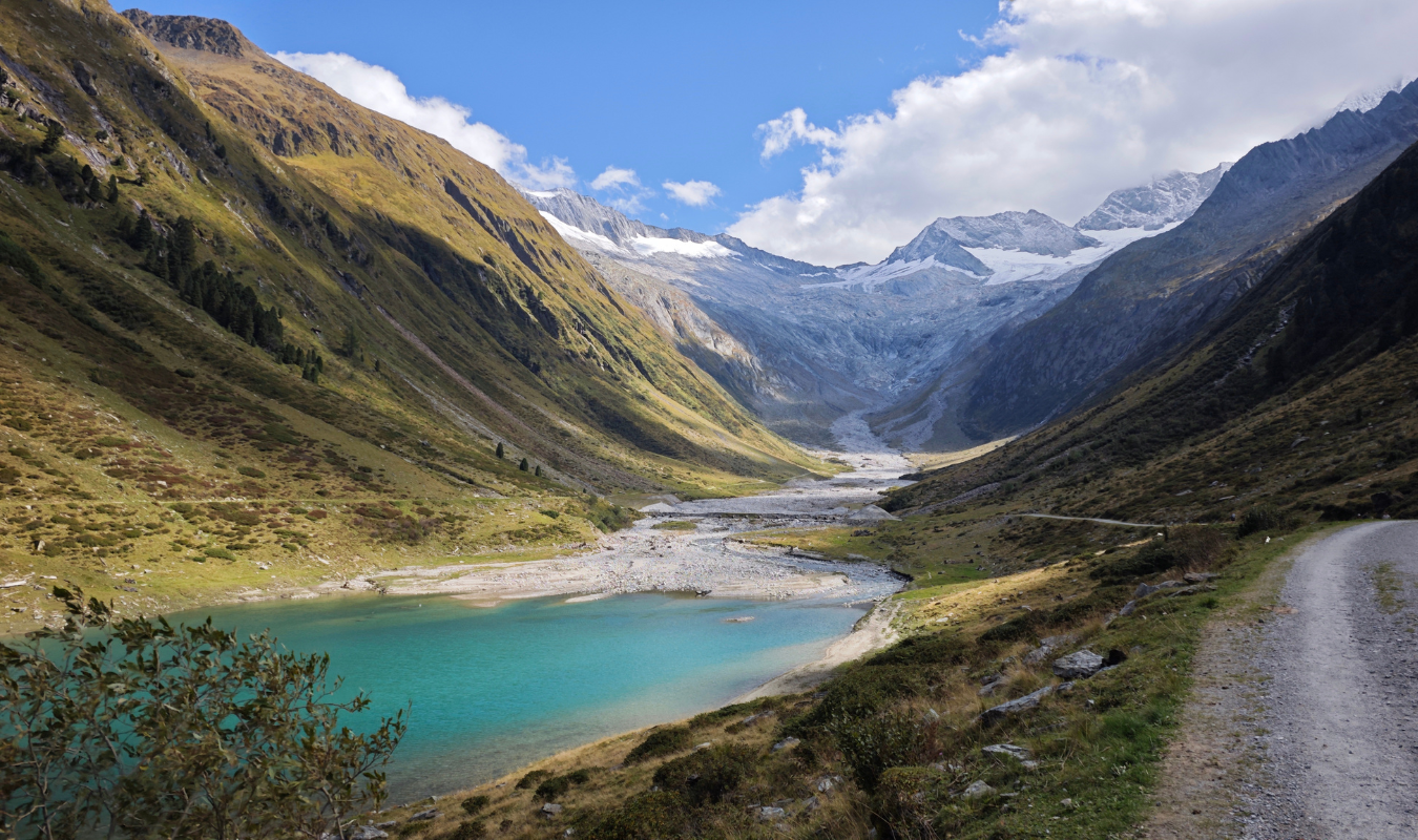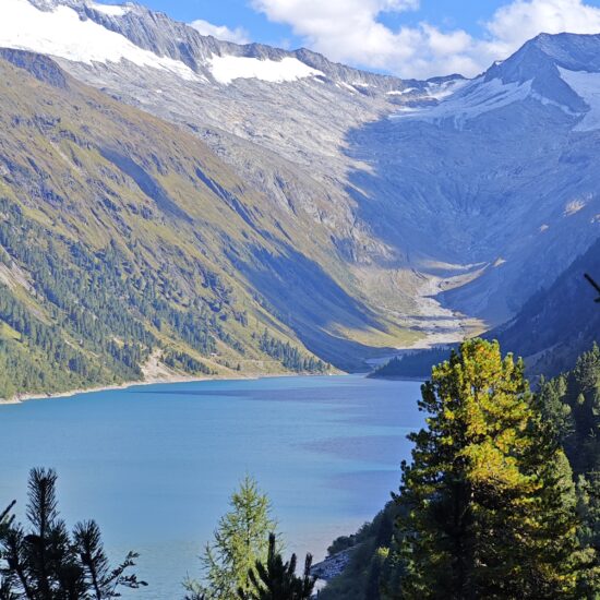 Tras el desayuno en el refugio, emprendemos nuestro último día de ruta, bajando por un sendero panorámico y fácil de andar, con vistas constantes a los glaciares que dejamos atrás. A medida que descendemos, aparece ante nosotros el Lago Schlegeisspeicher, un embalse de aguas azul turquesa, dominado por la silueta del Hochfeiler (3.510 m), el pico más alto del Zillertal.