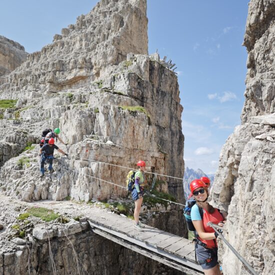 Nuestro recorrido, alejado de los caminos más turísticos, nos permite adentrarnos en un paisaje salvaje entre agujas de roca y realizar una vía ferrata que combina historia y aventura. Cruzaremos túneles que formaban parte de la línea de defensa del Ejército Italiano durante la Primera Guerra Mundial, y ascenderemos hasta una cumbre a 2.746 m de altitud. La primera parte transcurre por una faja rocosa sin dificultad técnica, seguida de un divertido sube y baja entre rocas, escaleras y miradores, siempre seguro y sin pasos expuestos.