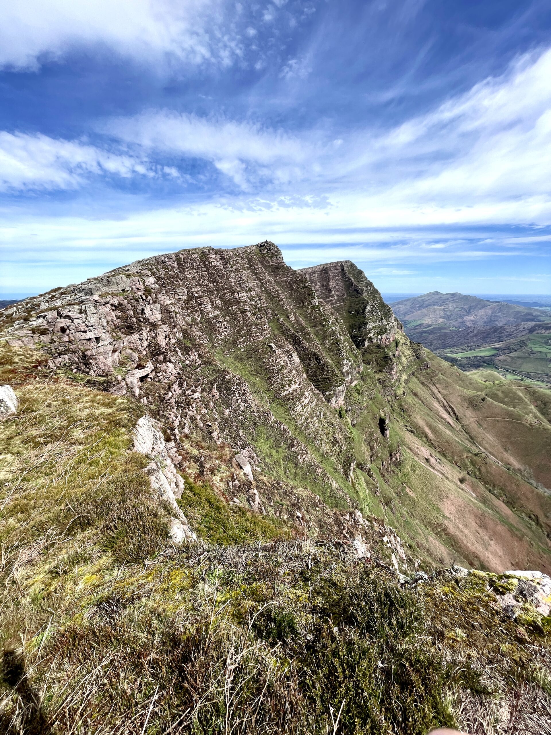Seguimos caminando por senderos herbosos y amplias lomas hasta alcanzar la cima del pico Iparla, un mirador natural con vistas sobre el Baztan y los Pirineos occidentales.
