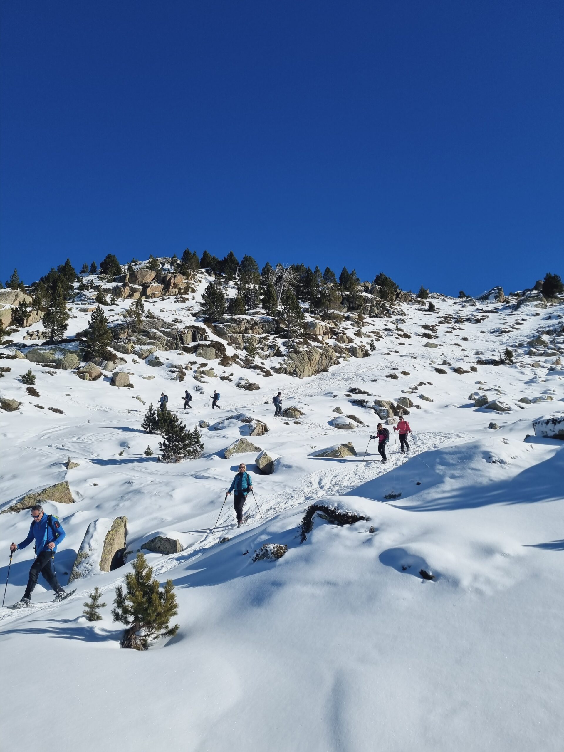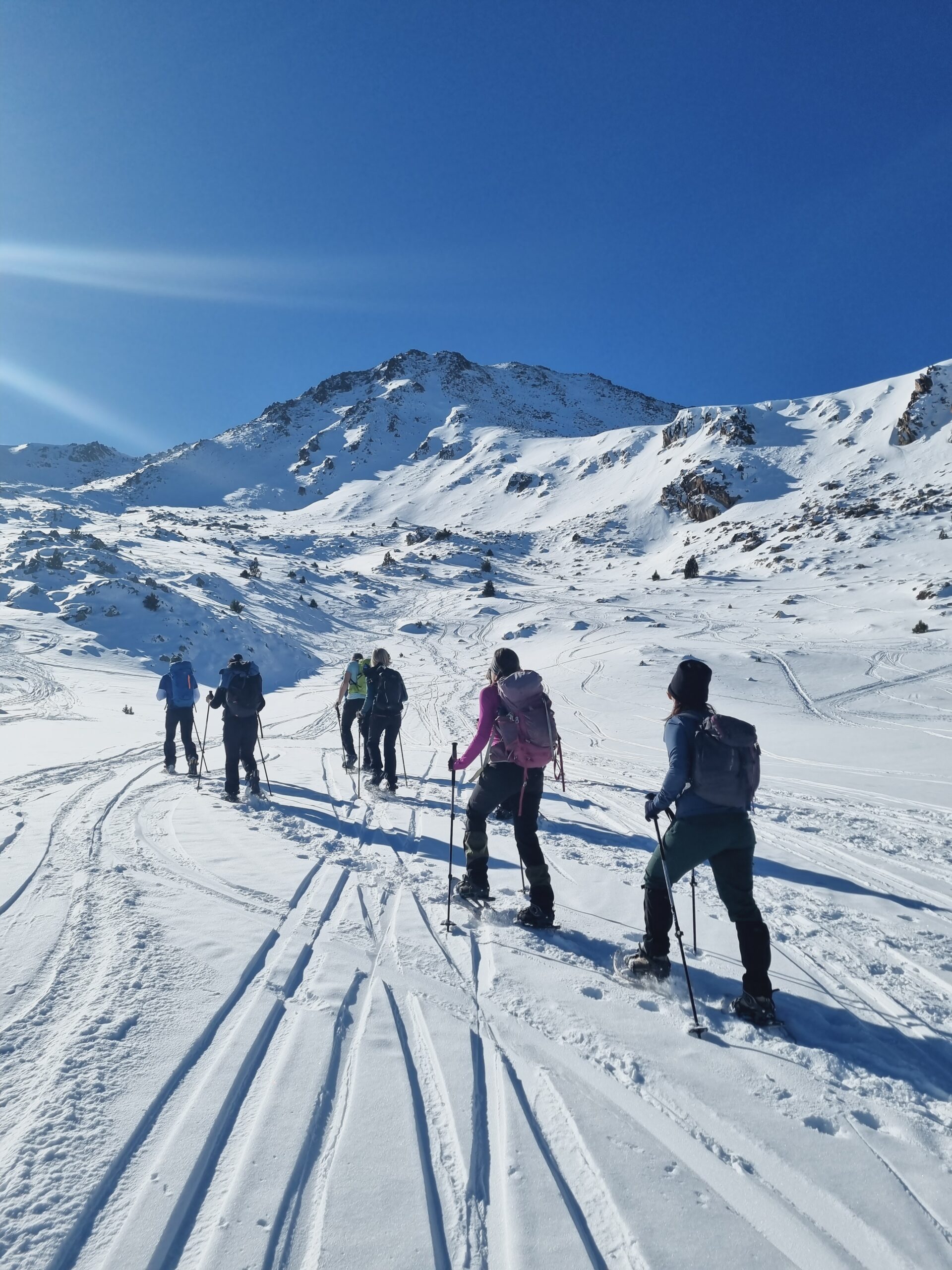 Per a la tornada triem una altra vessant, descendint cap als nostres vehicles mentre contemplem el paisatge nevat de la vall. Des d’allà emprenem el retorn a Barcelona.